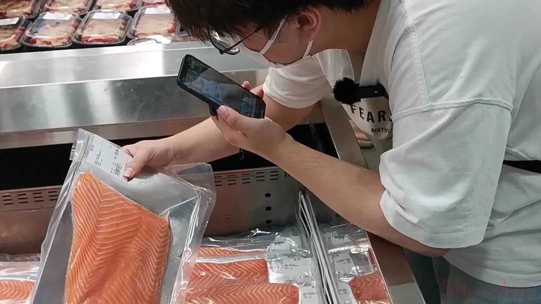 2楼烘焙、生鲜区域的人流相对较多,我在这里见到了正在直播的小智,他戴着蓝牙耳机,领口别着麦克风,拿着手机边逛边直播介绍一款上百元的三文鱼片。