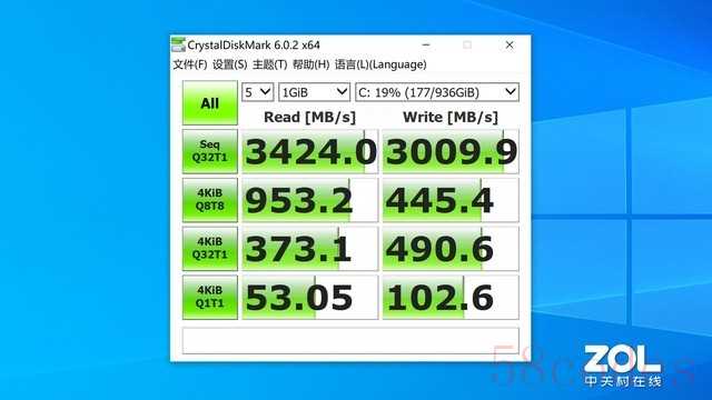 我手上这台XPS 15直接配置了1TB大容量固态硬盘,PCIe接口使其在性能发挥上游刃有余。从测试成绩来看,1GiB数据5次读写,队列深度为1的情况下Seq Q32读取3424MB/s,写入3009.9MB/s,4K各项成绩也相当出色,是一块读取和写入性能非常均衡的固态硬盘。