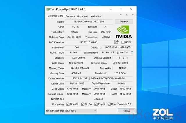 GTX 1650独显拥有4GB GDDR5显存,128bit显存位宽,1024个流处理器,核心频率1395MHz,Boost频率1560MHz,性能处于主流水准。