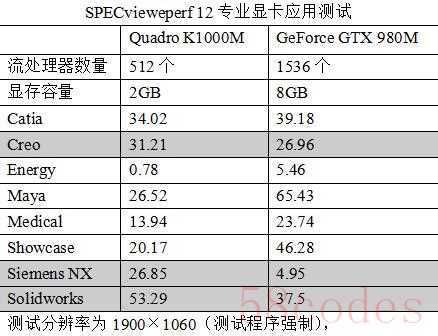 我们使用SPECvieweperf 12对Quadro M1000M进行专业性能评估测试,这款软件集成了Solidworks、Siemens NX、Showcase、Medical、Maya、Energy、Creo、Catia等能源、医疗、制图专业软件测试工具,是目前最广泛使用的专业性能测试软件。而作为对比,我们直接就用目前笔记本端最强级的GeForce GTX 980M,它的流处理器数量是Quadro M1000M的3倍(1536个),显存容量也达到8GB,从游戏本的角度来说似乎是一场没有悬念的虐杀,但事实果真如此?