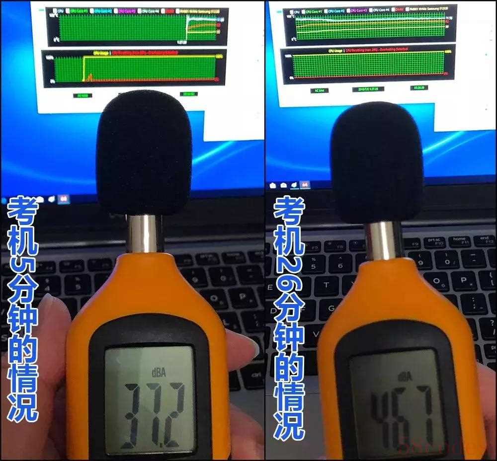 ●风扇转速的提升是个缓慢的过程,实际上考机19分钟时,转速也就5500转/分钟;而在考机进行到26分钟时,转速才达到7000转/分钟。此时风扇声音明显尖锐了不少,但实际的噪音也就46.7dBA,依然不算大。大家或许对此没有概念,我打个比方:一台满负荷运行的i5/GTX 1660Ti游戏本,运行噪音可达57dBA,噪音听感要高出数倍之多。