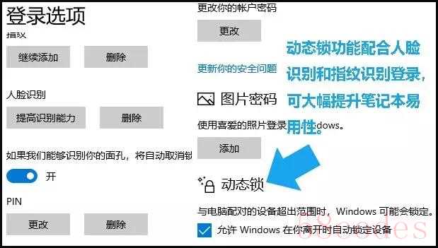 另外还有个易用性体验要强调:Win10如今提供了“动态锁”功能。你可使用手机或智能手表与笔记本进行蓝牙配对,连接好后,一旦你携带蓝牙设备离开座位一定距离,系统感应不到配对的蓝牙设备,就会自动锁定Windows屏幕。这极大地提升了笔记本的隐私性。而当你靠近电脑,摄像头几乎可在1秒左右识别用户并自动登录系统进入使用状态。而这种“小便利”实实在在地方便了用户的使用(实际上,这还会让用户形成习惯和依赖性——就好像大家习惯了手机上的指纹登录或是人脸登录后,如果让你输密码,你反而会觉得不方便)。