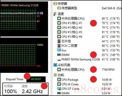 ▲这是持续考机38分钟后的情况(室温26℃):处理器全核2.42GHz左右,封装功耗15W,大家可看到处理器风扇7740转/分钟的高转速。不过处理器的温度并不高,最高也就81℃,内存65℃。