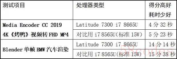 Media Encoder CC视频转码和Blender渲染都是常见的专业应用,前者做视频的用户经常用到,后者是做3D建模和渲染的用户常用的。测试环境都是2×16GB。大家可直观看到Latitude 7300的i7 8665U在实际应用中大幅领先于标准15W性能释放的i7 8565U——实际上,两颗处理器的频率仅有0.1GHz(基础频率)/0.2GHz(睿频)的差距,所以前者显然不仅是通过频率高一点点取胜,而是性能释放显然更强。