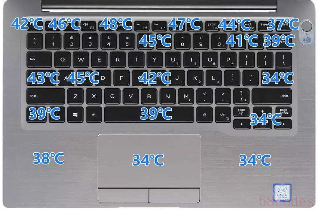但请大家牢记一点:这是在极限高负载持续了38分钟后的情况,也就是用Latitude 7300进行持续的专业应用(比如剪辑一段短视频),处理器持续满负载后的情况,而在这种情况下,一般用户是不会进行键盘操作的。我们极限考机测试仅仅是考证在这种高负载状况下外壳温度是否会“难以接受”——而答案是:它的表现不错,没有问题。