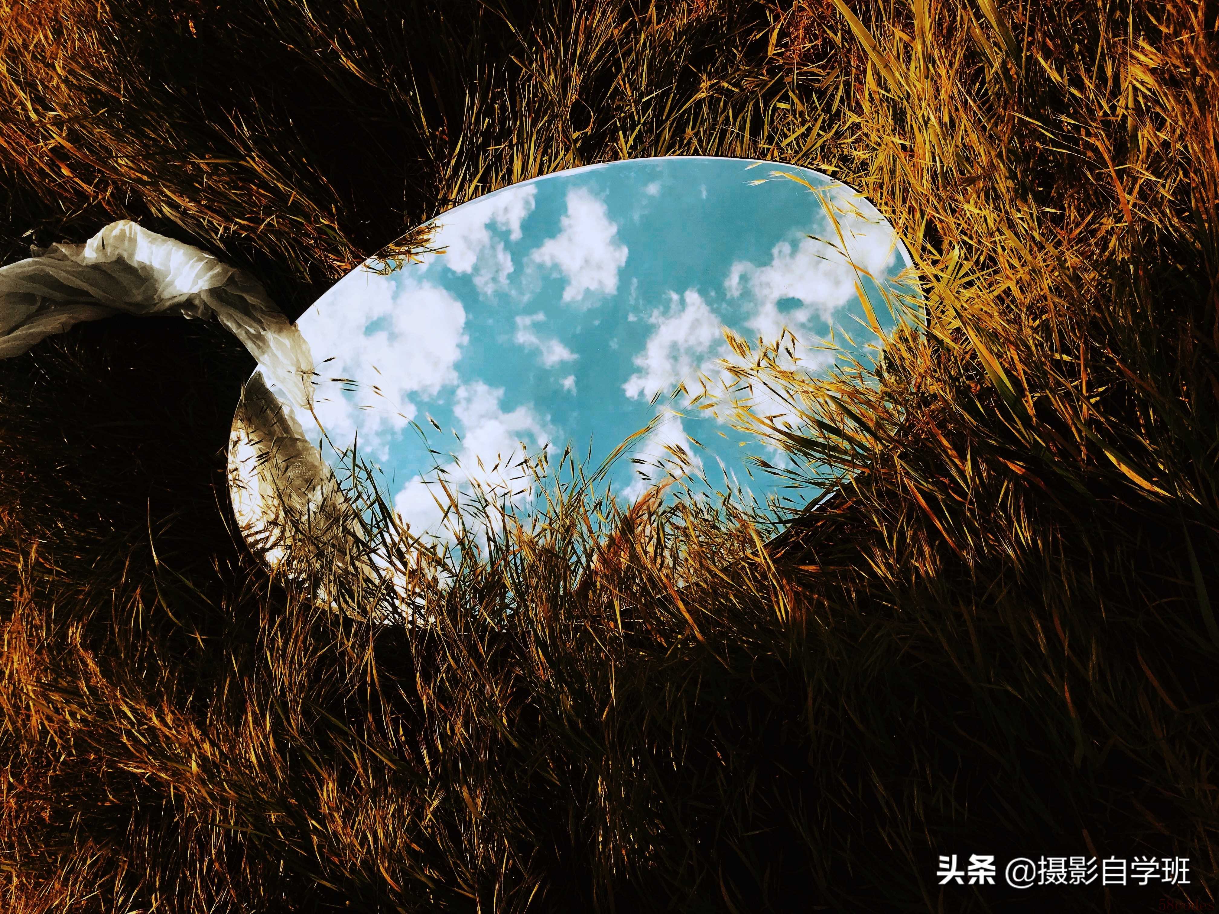 (3)还可以使用一些道具,比如镜子,来倒映天空的云朵,云彩与野草结合,蓝与黄的冷暖对比,白云作为装饰,很有特色。