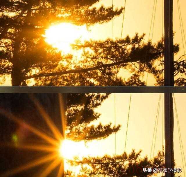 上图就是夕阳下的太阳,当强光透过树叶,遮掉了一部分光源后,变为点光源,拍摄就能得到星芒的效果。