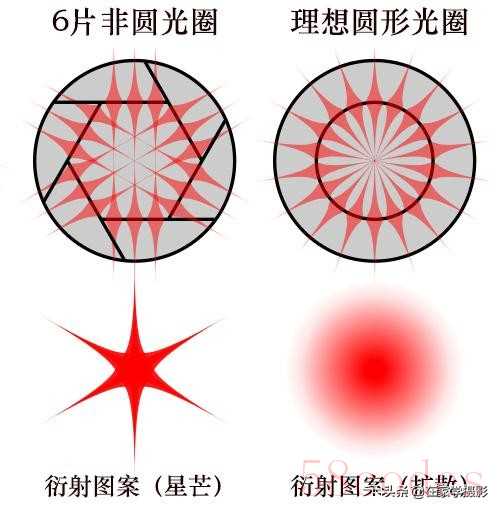 简单来理解一下,光圈是由数个叶片组成的,之间的小孔理论上应该做成一个标准的圆形孔,但由于多方面原因,这个孔不是一个标准的圆形,都是我们常见的多边形外观。