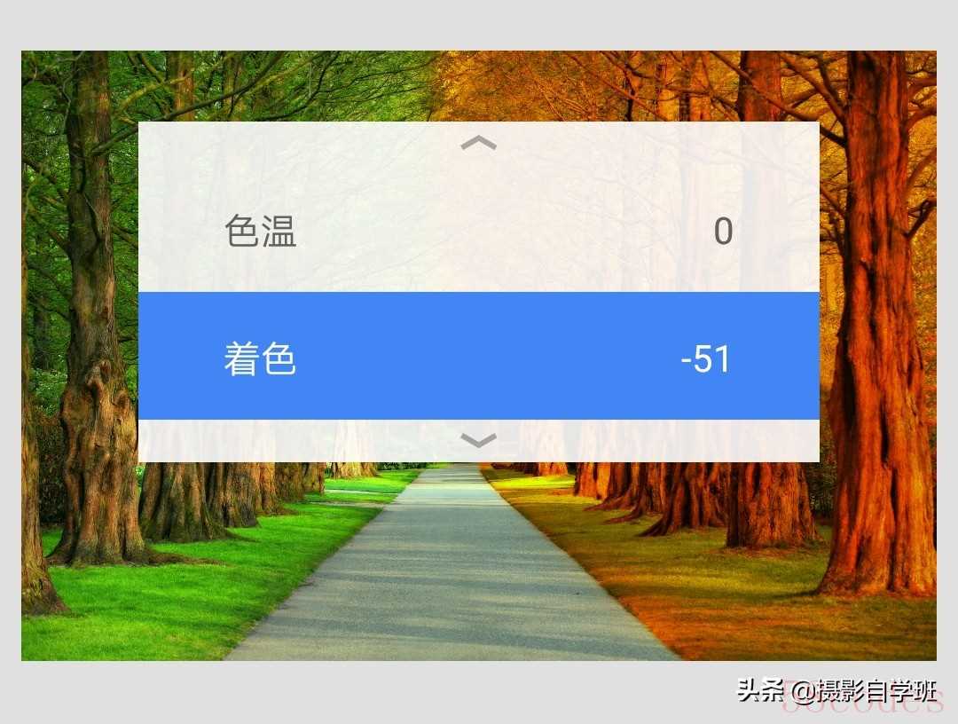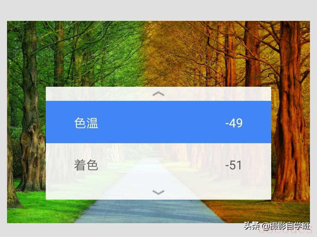 (9)观察发现,通过多次调解,照片除了黄以外,还有些红,不那么自然。所以,工具,白平衡,降低着色,降低色温,可以染照片黄得更自然。