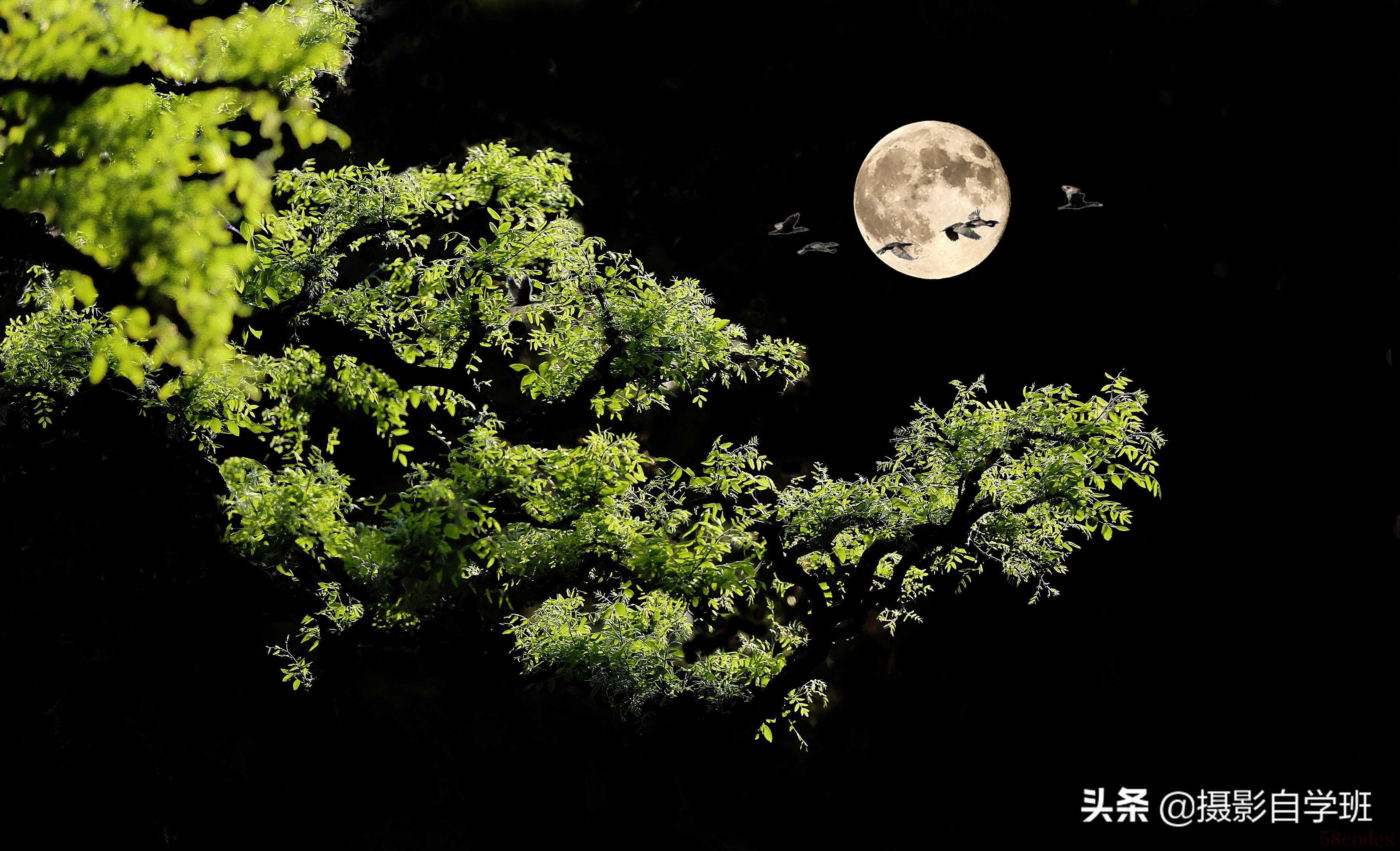 (2)借助路边灯光照亮树木,有月亮做装饰,也点缀了整张照片。如果没有拍出大月亮,我们还可以通过后期来添加,详细的教程之前为朋友们介绍过,还不了解的朋友,可以点击下方链接查看:夜景照片咋拍好看?大月亮咋添加,光轨咋拍?这5个摄影技巧帮你
