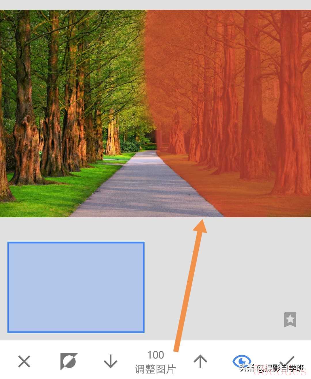 (8)在蒙版中,把下方调整图片数值调为100,对右侧树木,进行涂抹,让右侧树木变成刚调色后的颜色。保存此步后,再重复步骤8,对每一次调整图片,都进行蒙版局部调色,让右侧树木足够黄。