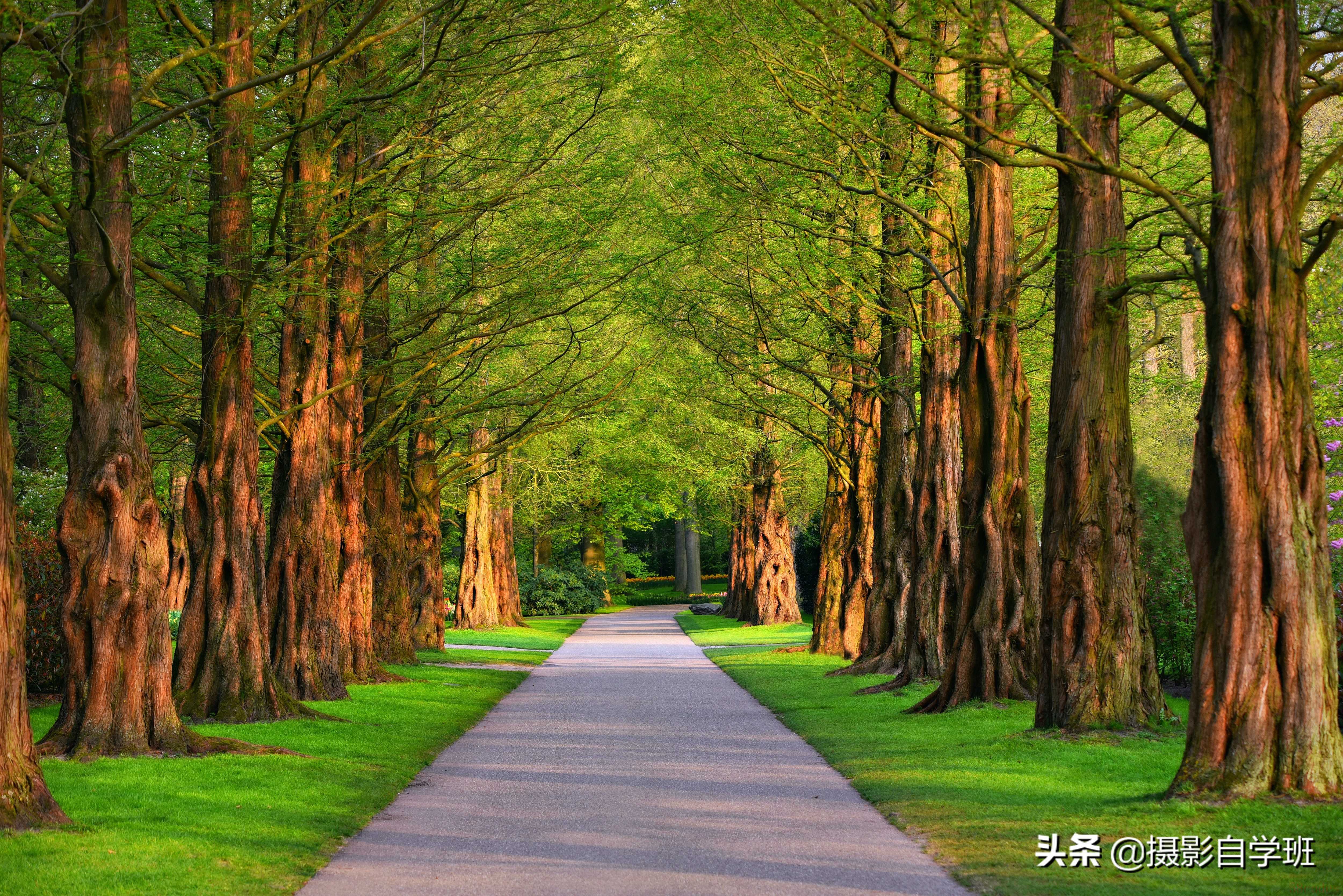 (1)把树木照片拍出韵律感:如果路上没车,可以站在中间(安全第一),如果路上有车,可以站在道路一侧。端平设备是前提,顺着路拍摄,让路在照片中延伸,成排的树木,在路边延伸,照片看起来更有韵律。