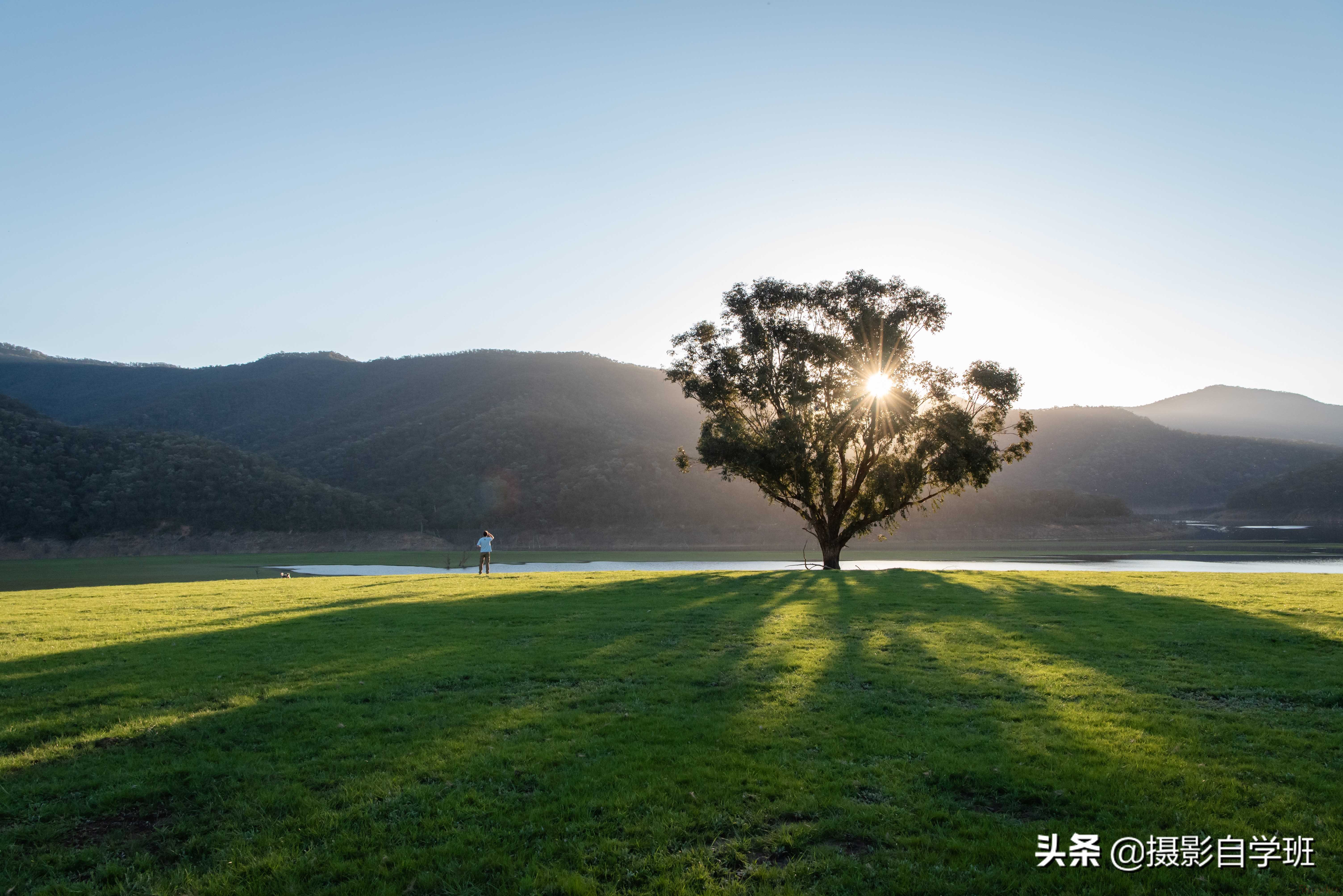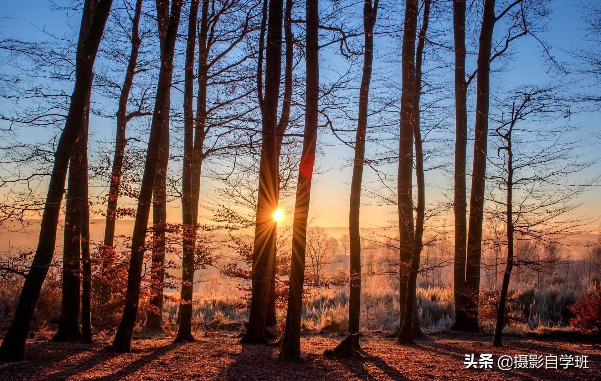 如果在太阳升起与落下前后半小时内,透过树木,可以拍到漂亮的星芒,这样,无论是一群树木,还是一棵树木,漂亮的星芒都可以起到很好的装饰作用,为整张照片加分。拍摄方法是: