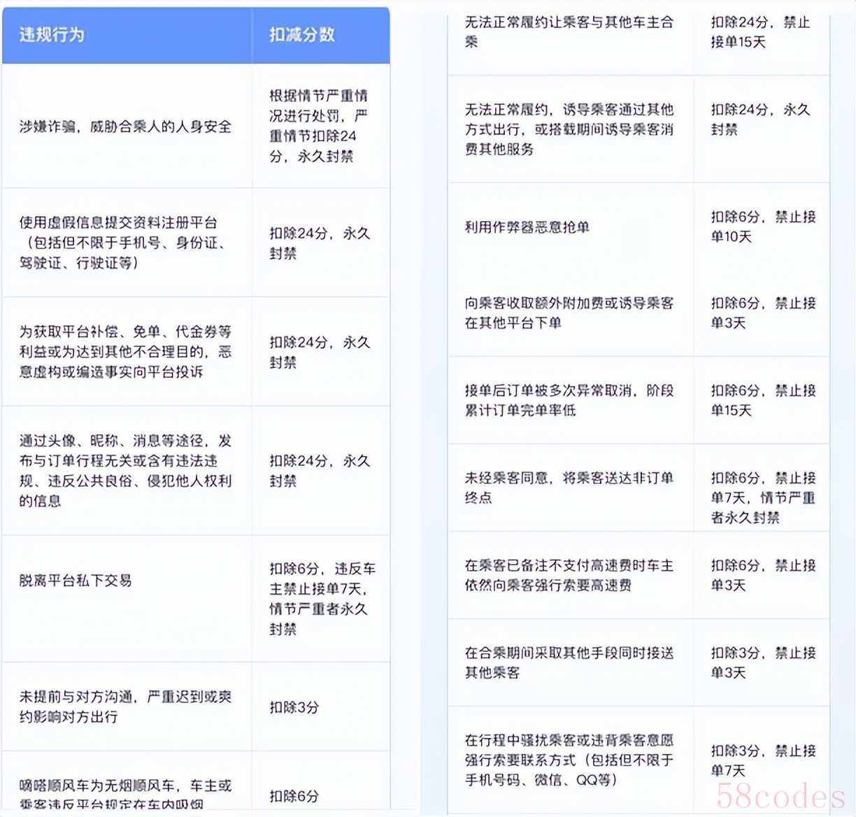目前,嘀嗒出行对车主和乘客对违规行为均制定了详细管理规则,一旦核实无误就将生效。在嘀嗒出行行为分管理机制中,一旦车主出现阶段累计完单率低(多次异常取消)、在合乘期间采取其他手段同时接送其他乘客,诱导私下交易、言语恶劣等行为,均会禁止接单并扣除相应行为分,一旦12分行为分被扣至零分,第一次将禁止接单15天,第二次将永久封禁。
