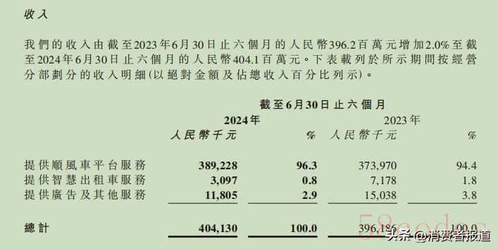 到了2024年上半年,嘀嗒出行提供顺风车平台服务的收入为3.89亿元,同比增长3.92%,占嘀嗒出行同期总收入的96.3%。