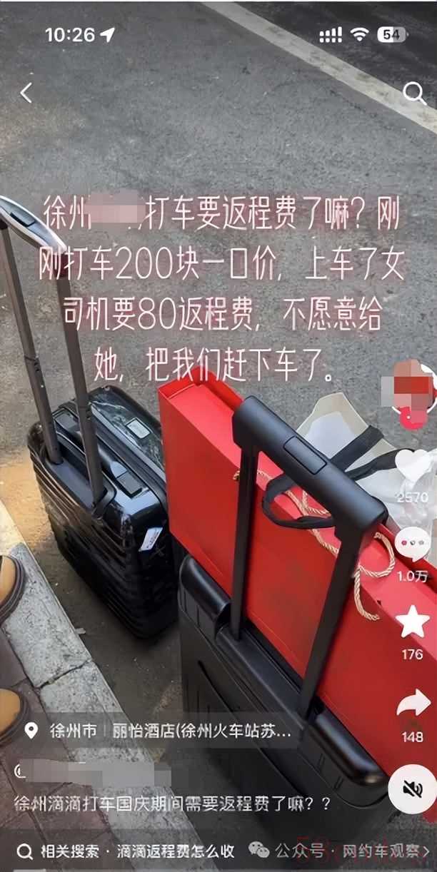 国庆期间,徐州一名女乘客在火车站打车回老家,软件上显示打车总费用是一口价200元,结果一上车司机要80元返程费,女乘客当着司机的面打电话给客服问收费是否合规,却被司机直接赶下车。她将这段经历发在社交平台上,引起了上万人讨论,全国各地的网约车司机也冲进评论区,说出自己的心声。