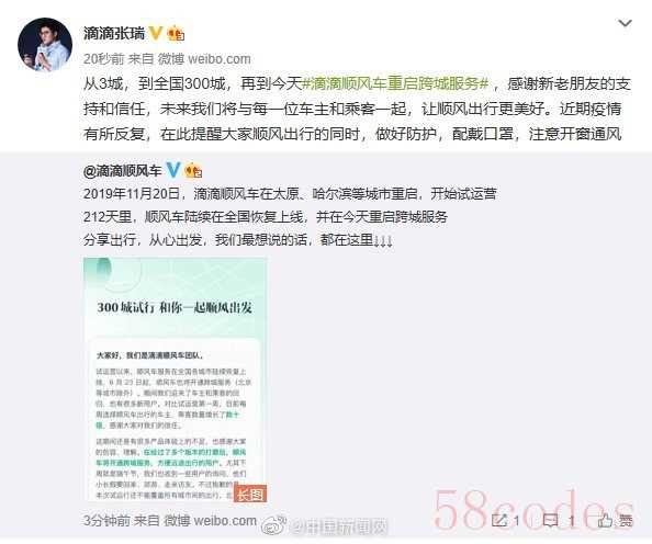 【#滴滴顺风车全国上线#】#滴滴顺风车将恢复跨城服务#19日,滴滴顺风车发布公开信称,截至目前,顺风车已陆续在全国300个城市重新上线试运营,并将在6月23日起恢复跨城服务。其中,北京等部分受疫情影响的城市,暂时不会开放跨城服务。(吴涛)