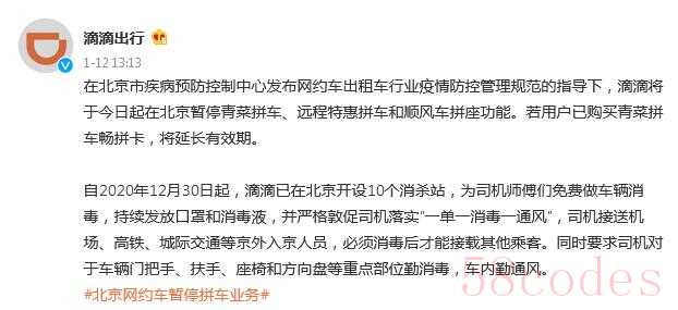 在北京市疾病预防控制中心发布网约车出租车行业疫情防控管理规范的指导下,滴滴将于今起在北京暂停青菜拼车、远程特惠拼车和顺风车拼座功能。若用户已购买青菜拼车畅拼卡,将延长有效期。