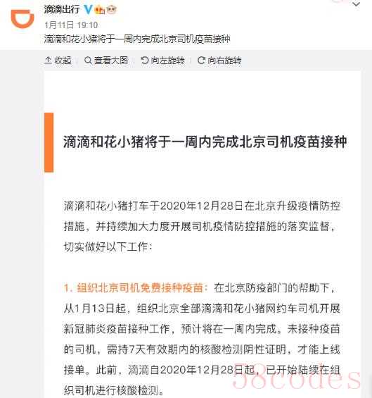 昨日,滴滴出行公告称,从1月13日起,组织北京全部滴滴和花小猪网约车司机开展新冠肺炎疫苗接种工作,预计将在一周内完成。