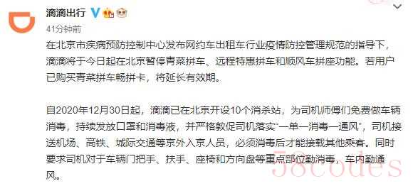 1月12日,据滴滴出行消息,在北京市疾病预防控制中心发布网约车出租车行业疫情防控管理规范的指导下,滴滴将于今日起在北京暂停青菜拼车、远程特惠拼车和顺风车拼座功能。若用户已购买青菜拼车畅拼卡,将延长有效期。