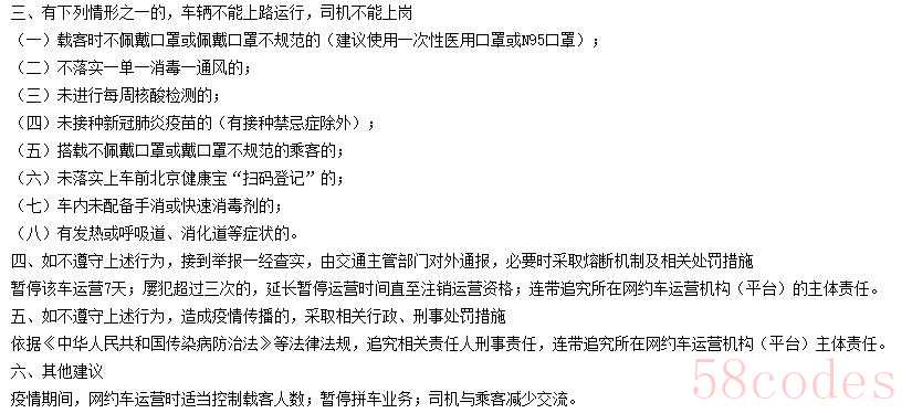 《规范》还对车辆不能上路运行,司机不能上岗的情形进行明确。包括载客时不佩戴口罩或佩戴口罩不规范的、不落实一单一消毒一通风的、未进行每周核酸检测的、未接种新冠肺炎疫苗、搭载不佩戴口罩或戴口罩不规范的乘客的、未落实上车前北京健康宝“扫码登记”的、车内未配备手消或快速消毒剂的,以及有发热或呼吸道、消化道等症状等。