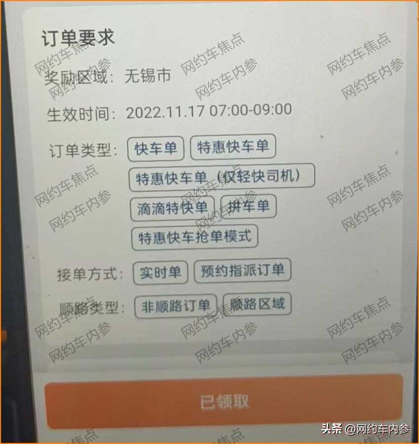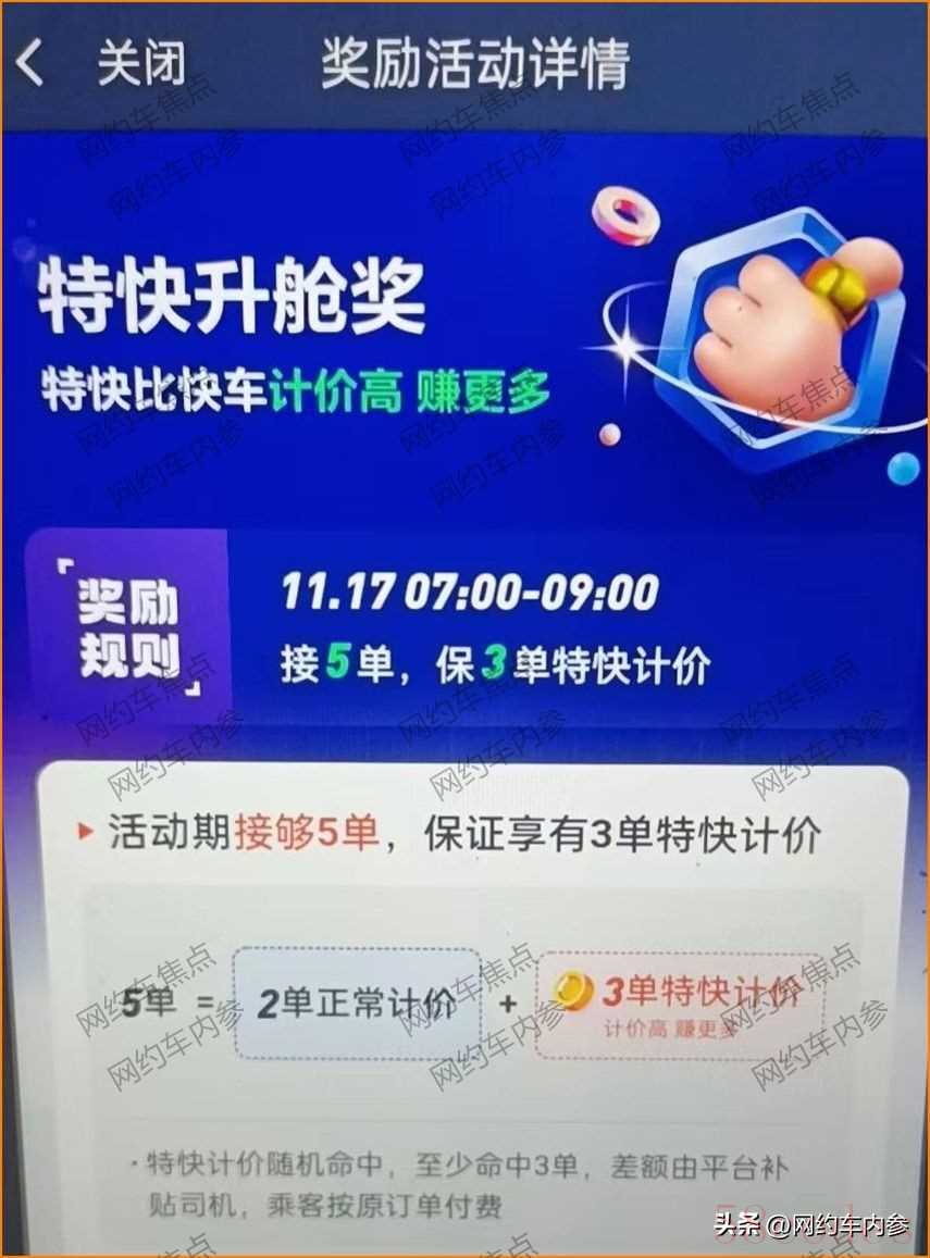 网约车内参讯(文/唐梓钦)11月17日,无锡滴滴司机杨师傅反映,当天上午7点到9点,平台推出了特快升舱活动,接满5单可以保证3单特快计价。