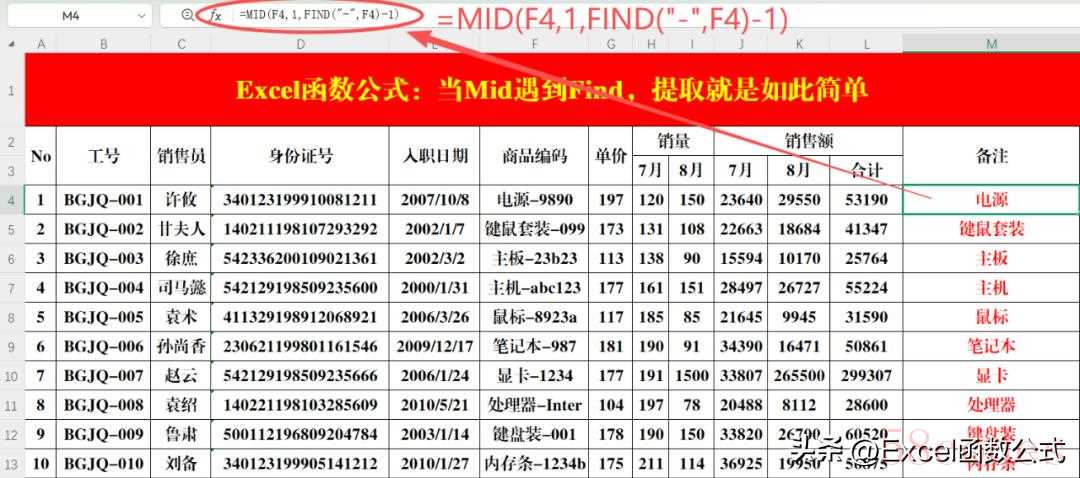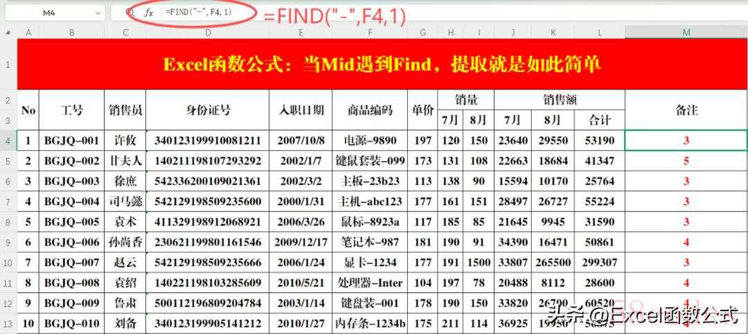 操作方法:在目标单元格中输入公式:=FIND("-",F4,1)。二、案例技巧1.提取指定的值目的:提取商品编码中的文字。原理:从基础数据中可以看出,文字不稳都在符号“-”的前面,所以利用Find函数定位“-”的位置,然后用Mid函数提取即可。