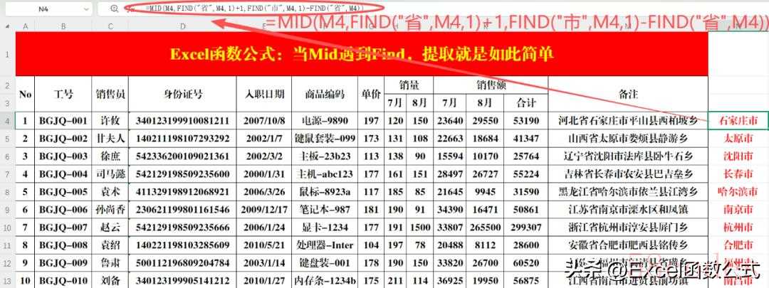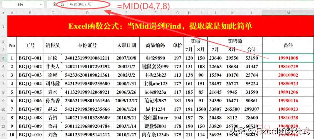 操作方法:在目标单元格中输入公式:=MID(D4,7,8)。案例说明:身份证号码中从第7位开始长度为8的字符串为出生日期。提取代表性别的数字也是同样的道理,只需输入=MID(D4,17,1)即可。(二)Find函数1.功能:返回一个字符串在另一个字符串中出现的起始位置(区分大小写,且不允许使用通配符)。2.语法结构:=Find(待查找字符串,源字符串,)。3.参数解读: