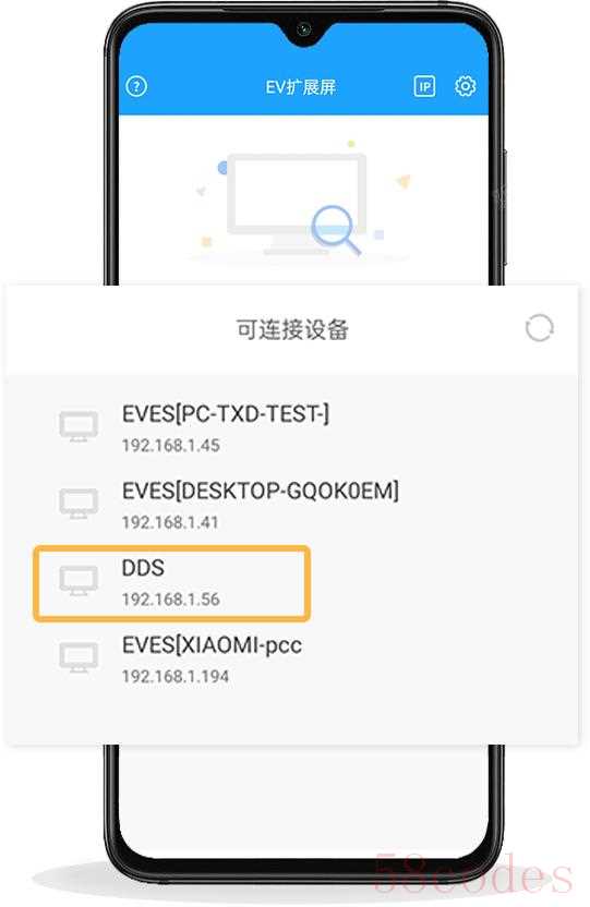 2、手机在EV扩展屏App上搜索电脑设备,点击电脑设备名。