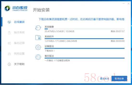 4、接着开始下载Win10系统和系统软件及相关驱动,下面让【小白系统】自动重新安装系统win10,无需操作电脑,可以去先忙其他事情。