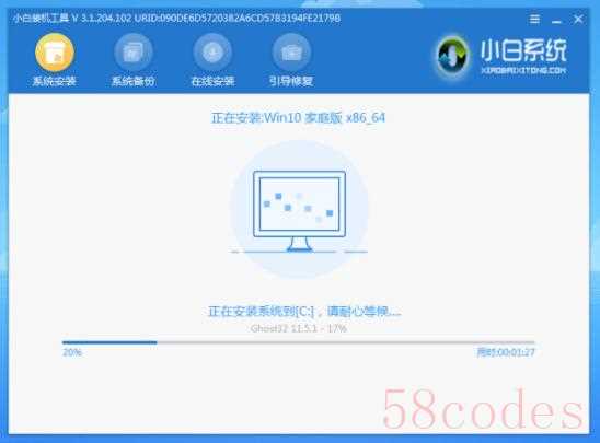 6、电脑重启后进入PE系统后,小白装机工具开始自动安装系统win10。