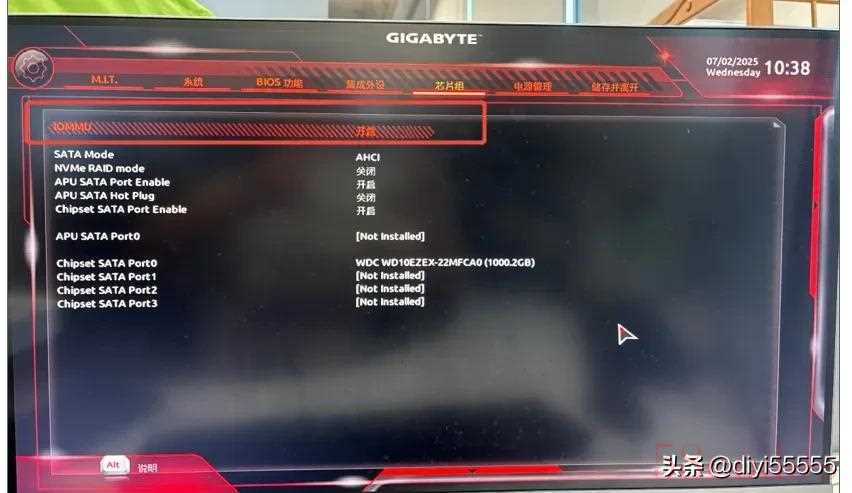 技嘉主板开机界面连续短按“F12/Delete”进入bios页面,选择“芯片组”▼ Intel ▼