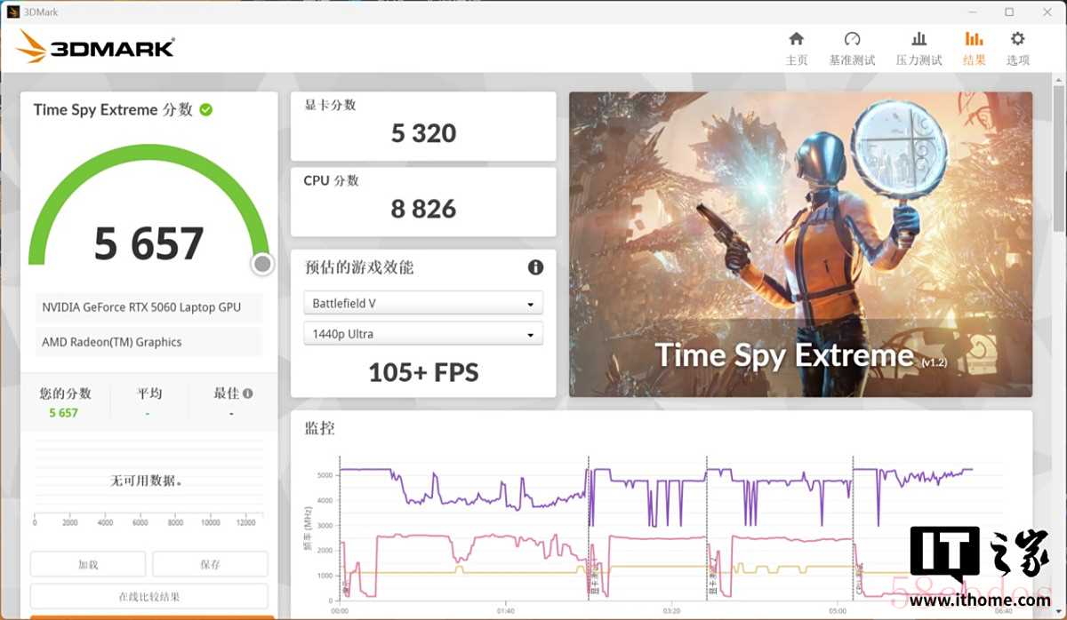 在 3D Mark 的 Time Spy Extreme 测试中,MEOW R16 Ultra 的显卡分数接近 5320 分,看来在最新 DX12 的游戏支持和性能表现上,RTX 5060 笔记本电脑显卡应该能轻松胜任。