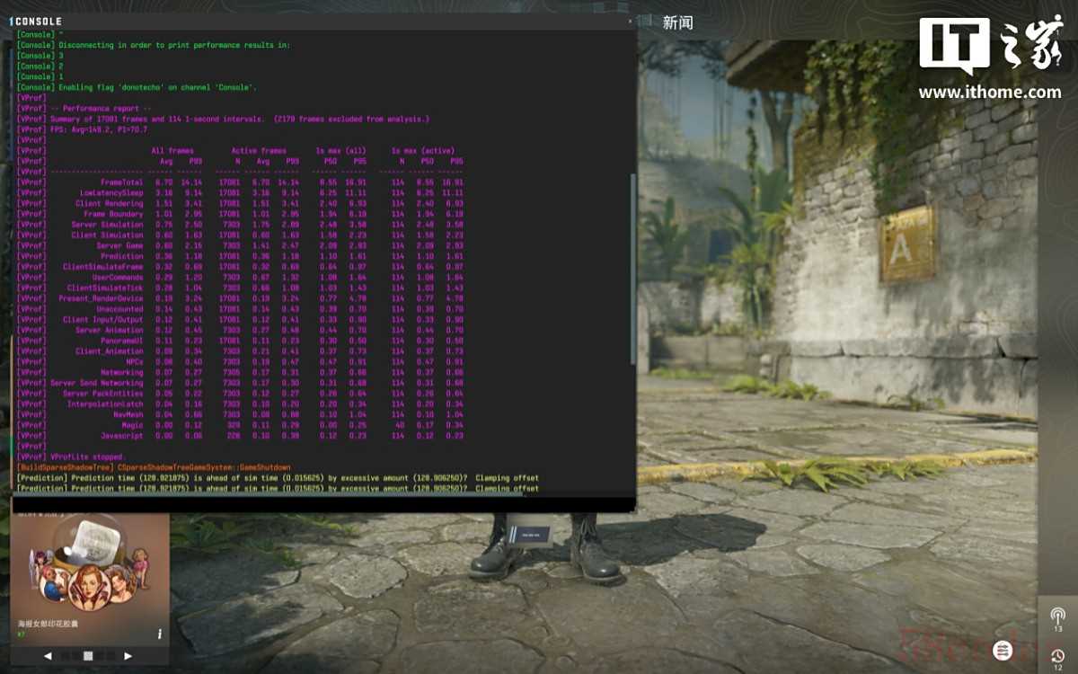 第一款游戏是时下最热门的在线竞技游戏《CS2》,游戏画质保持预设(高画质),不手动更改其他参数。此时游戏的平均帧数为 149.2 帧,1% Low 为 70.7 帧。