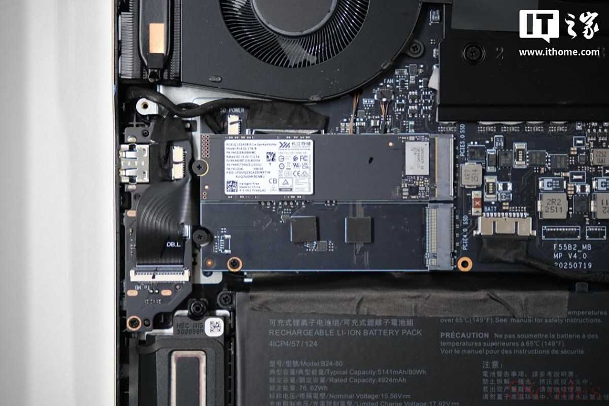 MEOW R16 Ultra 拥有两个 M.2 硬盘位,其均支持 PCIe 4.0。自带的 SSD 为长江存储 PC41Q 1TB。如对硬盘容量有更高需求的朋友可自行加装拓展。