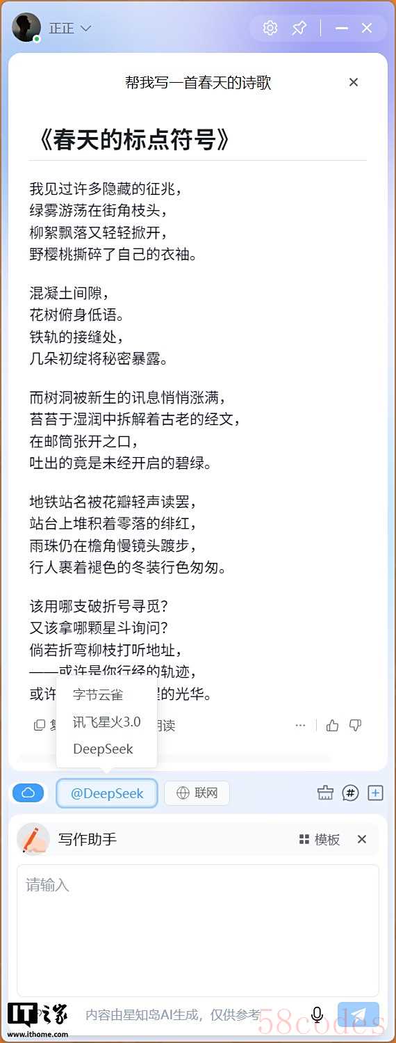 IT之家让星知云写一首关于春天的诗,模型生成速度还是很快的。