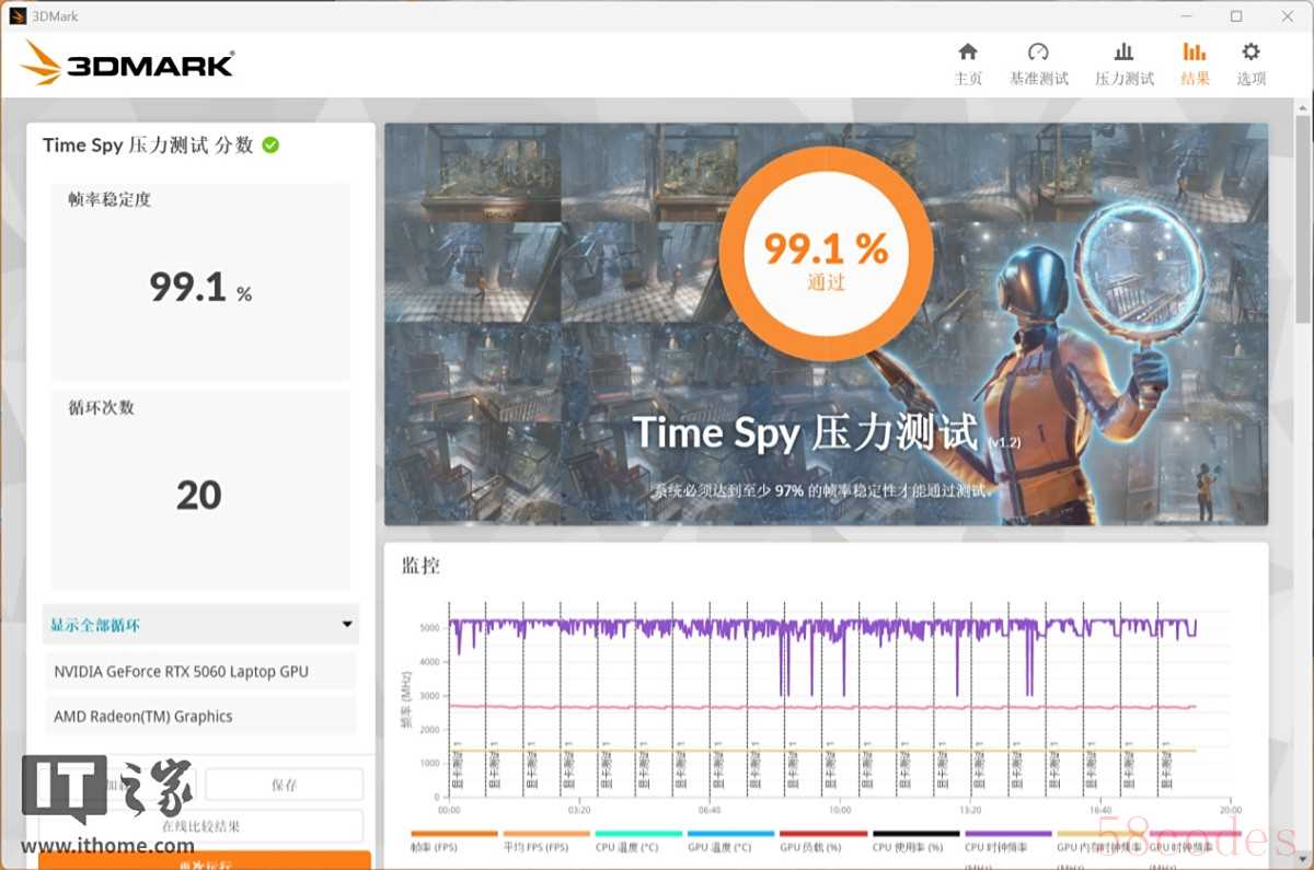 随后我们打开 3D Mark 的 Steel Nomad 压力测试进行稳定性考察,一般要求其成绩高于 97% 才算通过测试,表现合格。MEOW R16 Ultra 的 20 轮 Steel Nomad 循环最终成绩为 99.1%,顺利通过了测试。