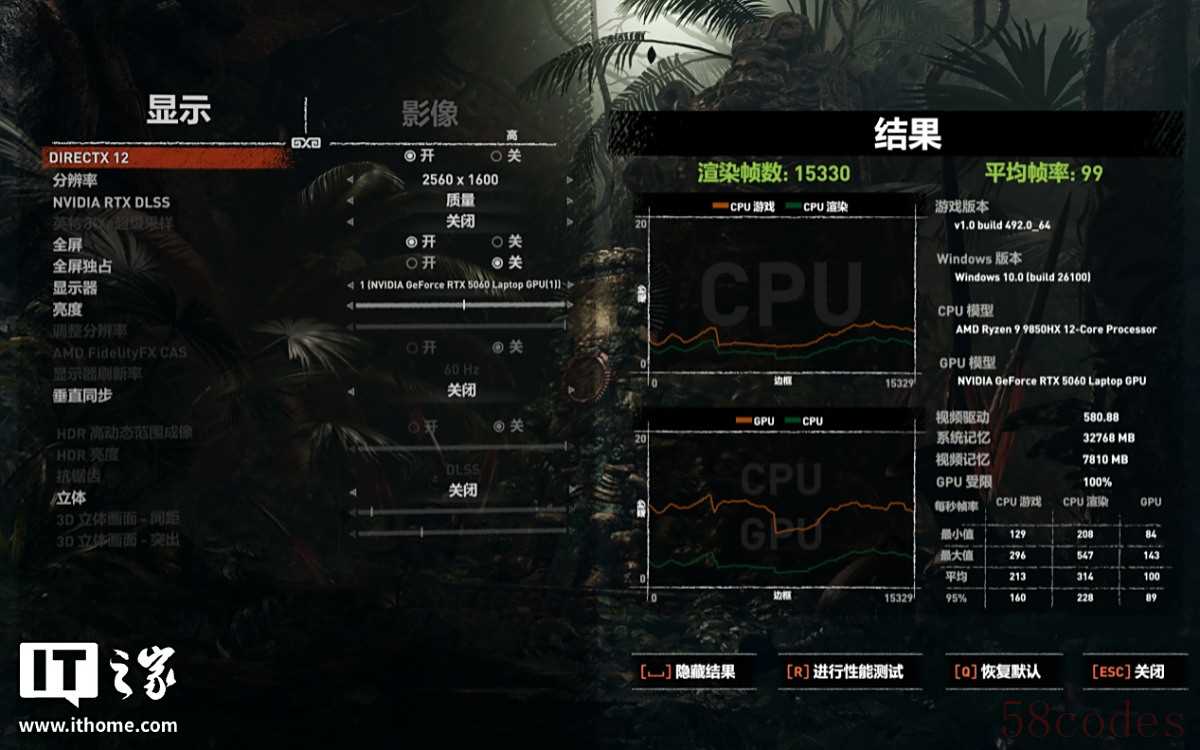 第三款游戏是老牌 DX11 游戏《古墓丽影:暗影》,进入游戏后选择 2.5K 分辨率最高画质,DLSS 质量档,平均帧数来到了 99 帧。