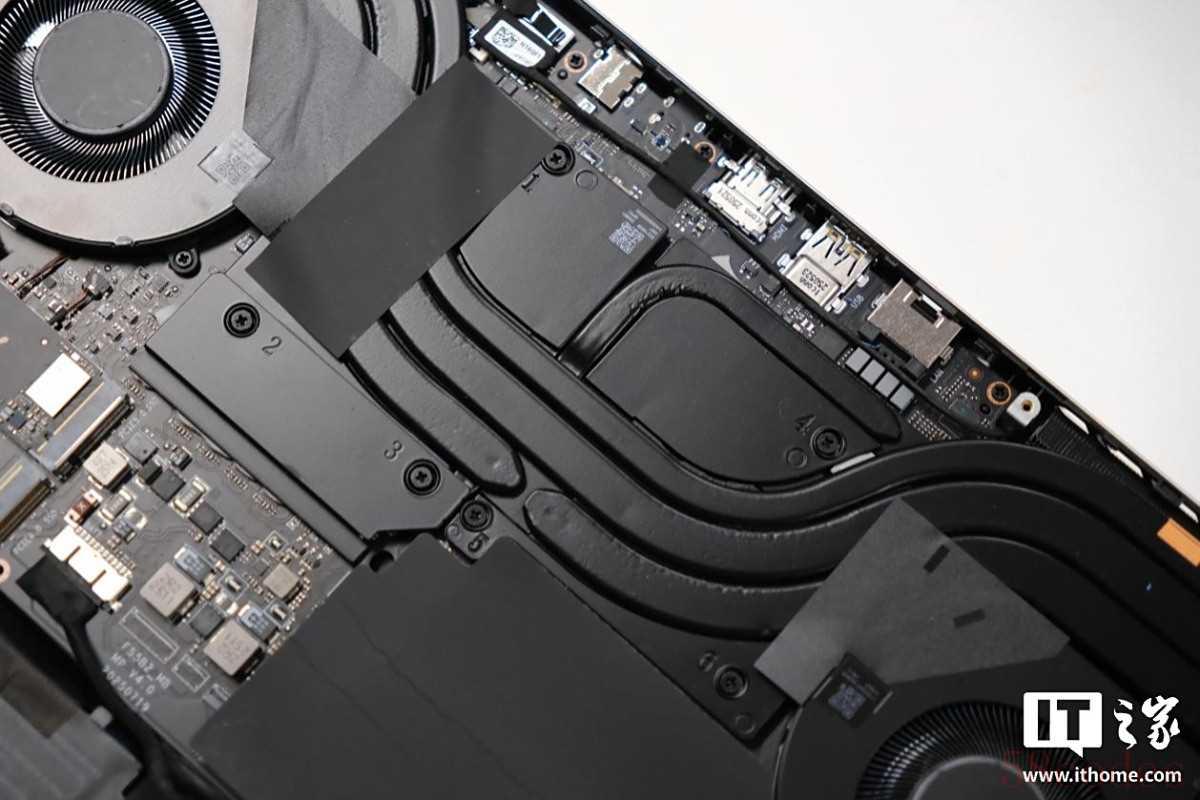 机身内部采用大尺寸的双涡轮风扇和 6 根导热铜管设计,并且在铜管上方 CPU 和 GPU 的位置还加盖了均热板。四个出风口均有大面积的散热鳍片,散热方面用料较为扎实。