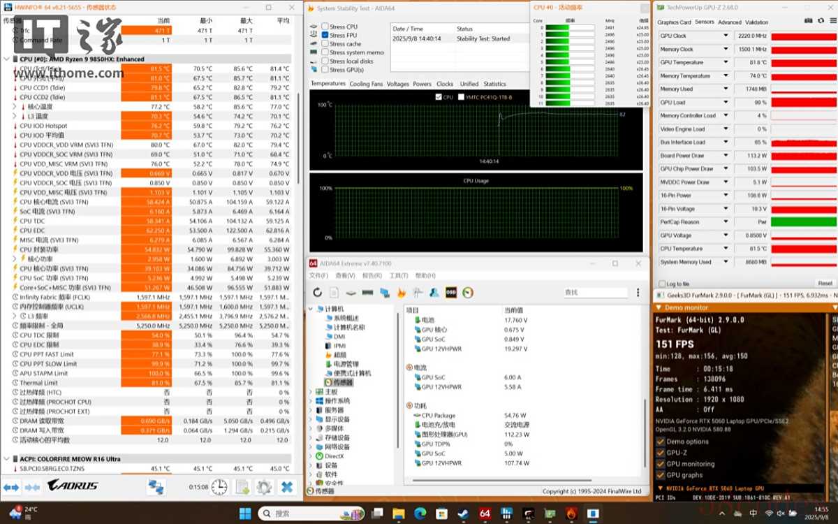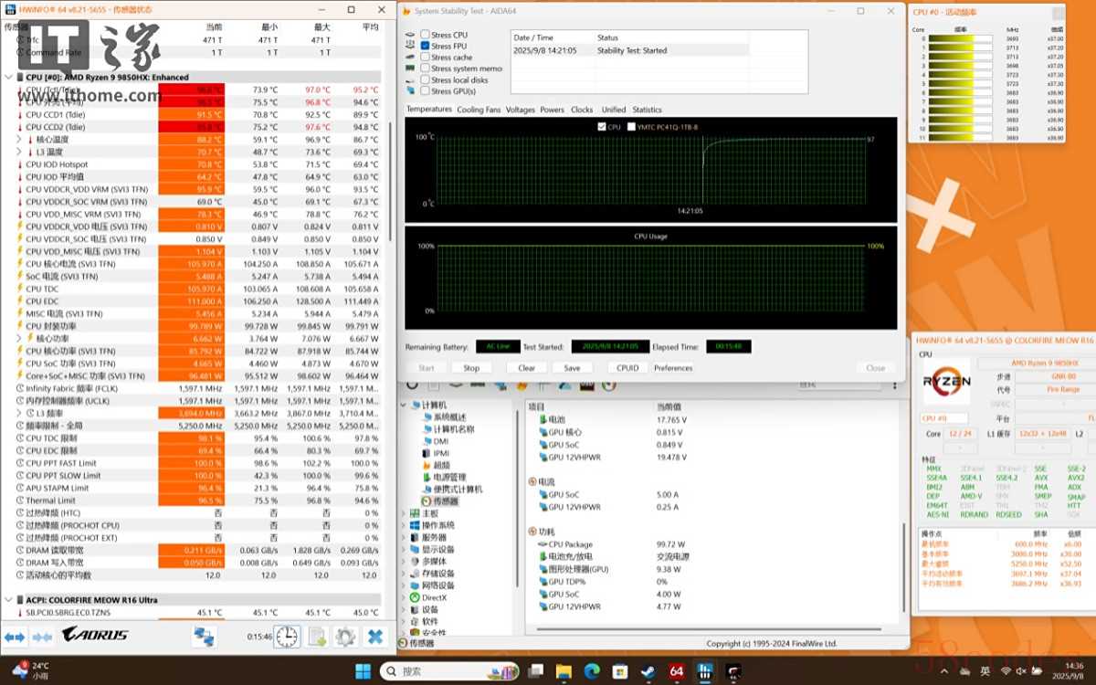 首先是 15 分钟的单烤 FPU,R9 9850HX 的功耗可以保持在 100W,温度为 96.6°C,12 个全性能核心的 CPU 频率则保持在 3.7GHz 左右。