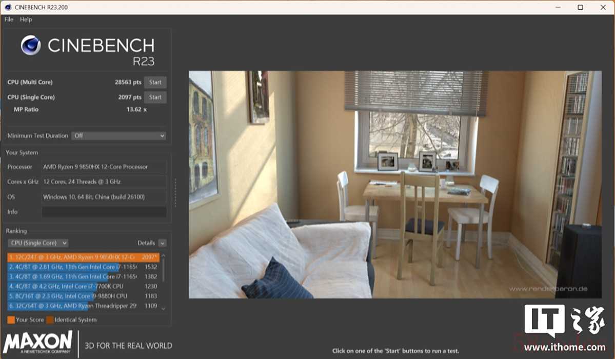 而在 CineBench R23 的测试,搭载 R9 9850HX 的 MEOW R16 Ultra 获得了单核 2097 分,多核 28563 分的成绩。