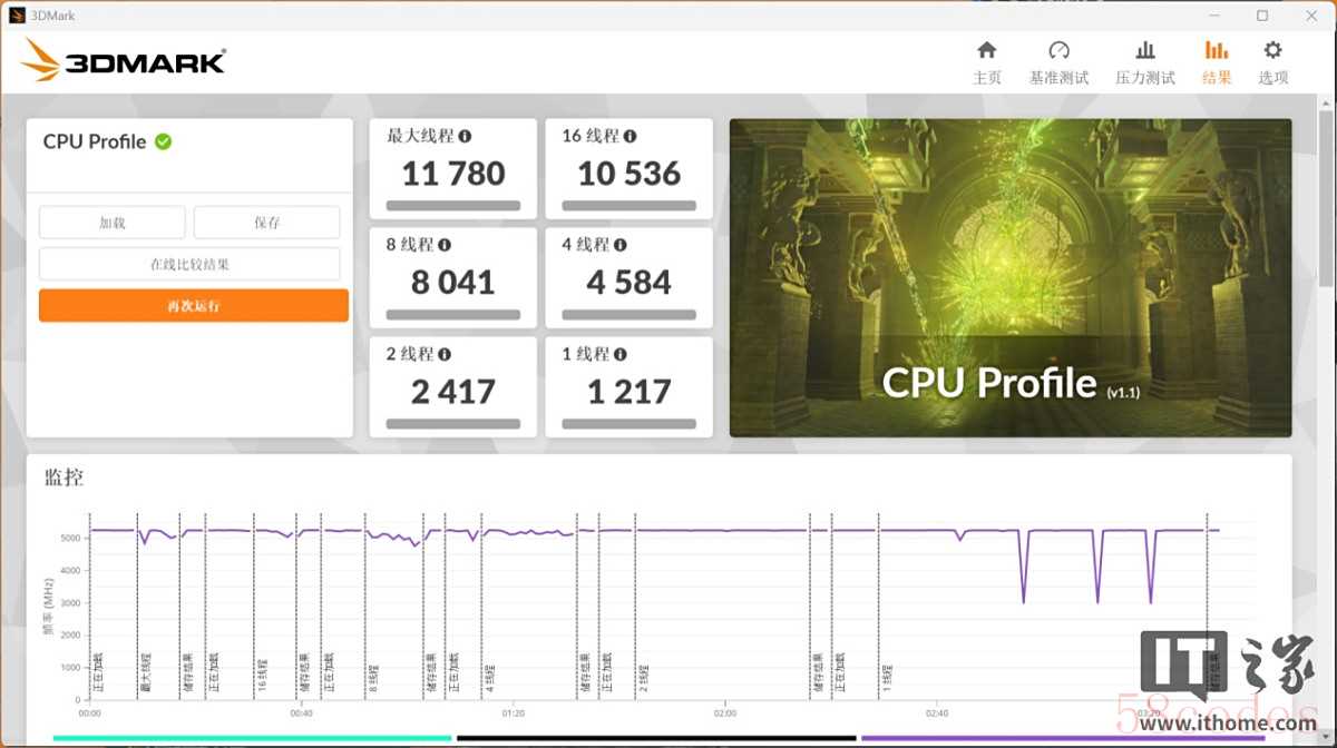 接下来是 3D Mark 的 CPU Profile 项目测试,COLORFIRE MEOW R16 Ultra 的 CPU 的单线程分数为 1217,最大线程分数来到了 11780 分。