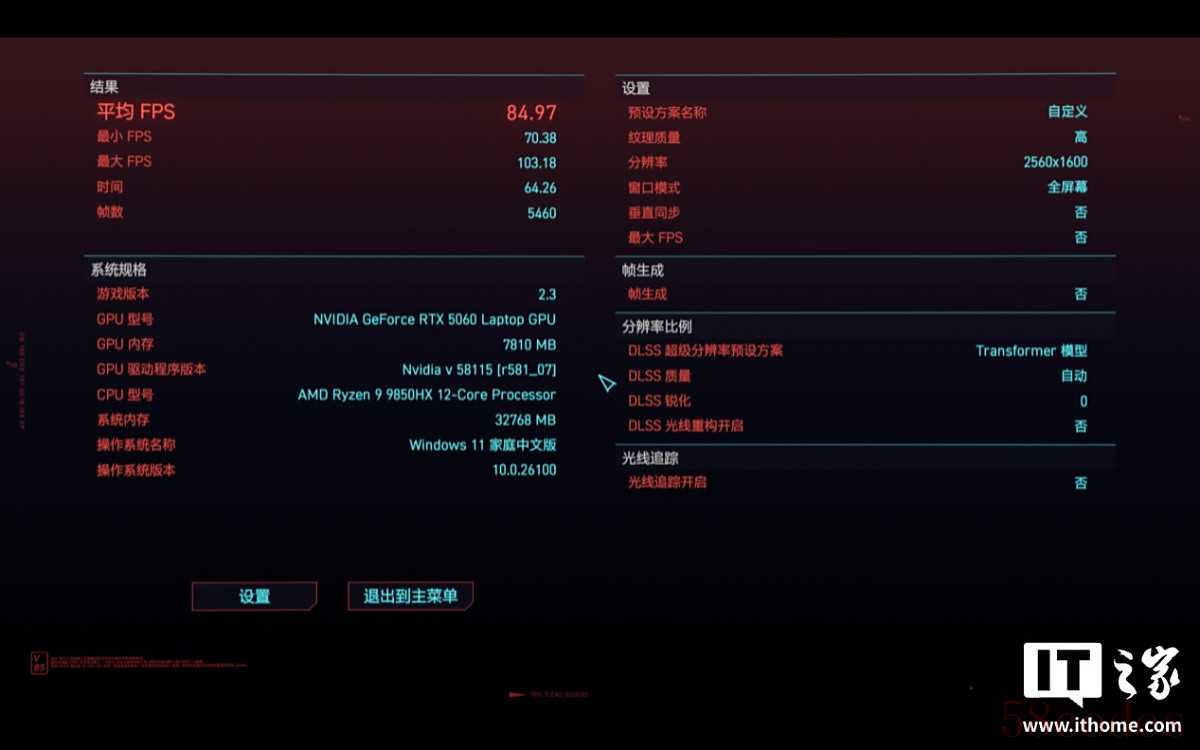 最后一款游戏为《赛博朋克:2077》,首先我们以原生 2.5K 分辨率高画质运行,不开启光追与 DLSS 4 帧生成,此时平均帧数为 84.97 帧。