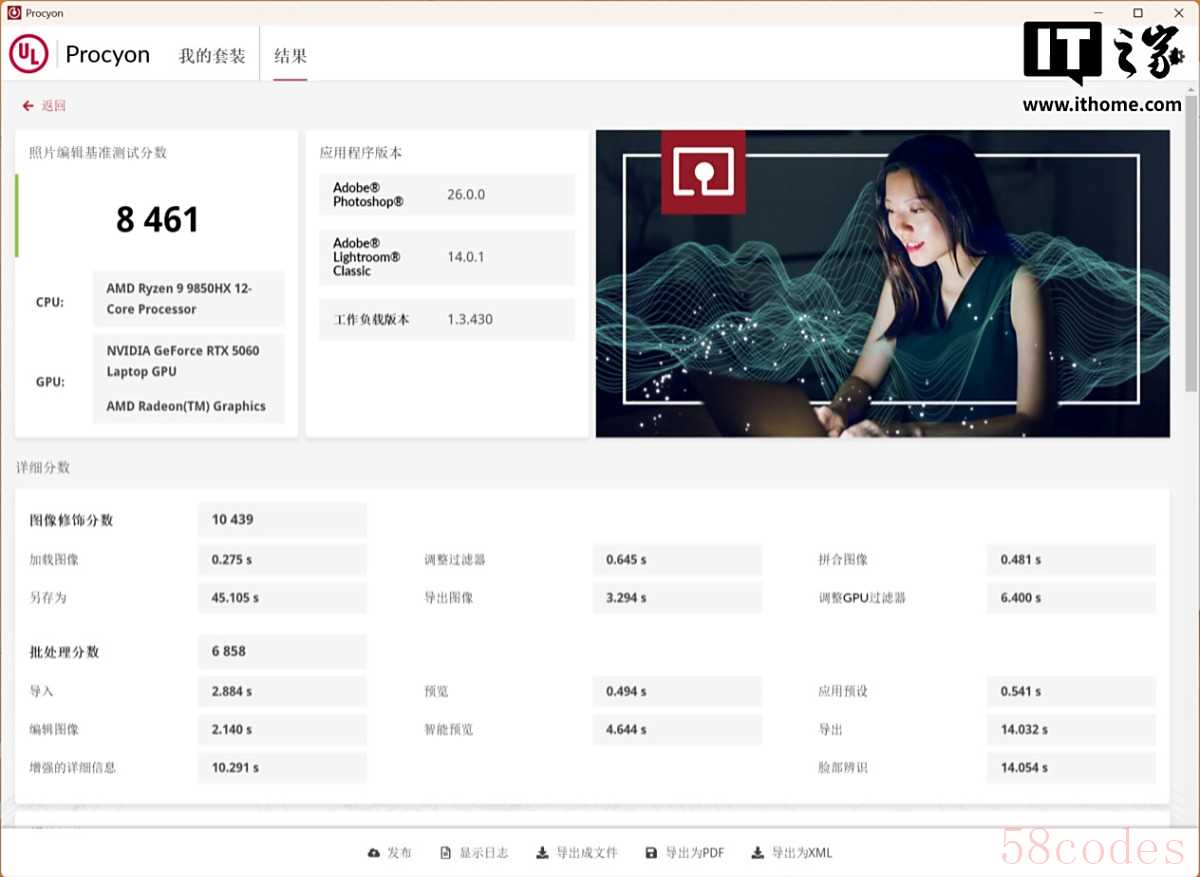 生产力表现上,IT之家使用 UL Procyon 分别测试了图像编辑与视频编辑。在照片编辑基准测试中,其获得了 8461 分,表现较为出色。
