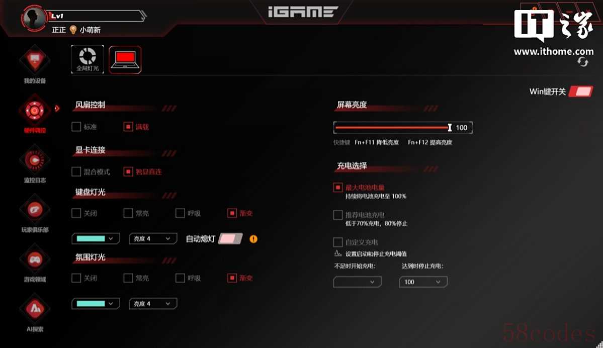 在测试游戏前,我们将 COLORFIRE MEOW R16 Ultra 设置为控制中心里提供了 3 种性能模式,风扇工作模式可以手动调节,测试中我们一律采用狂暴性能 + Turbo 风扇转速 + 独显直连模式进行,游戏测试环节我们选取 5 款主流游戏,以 2.5K 原生分辨率进行实测。