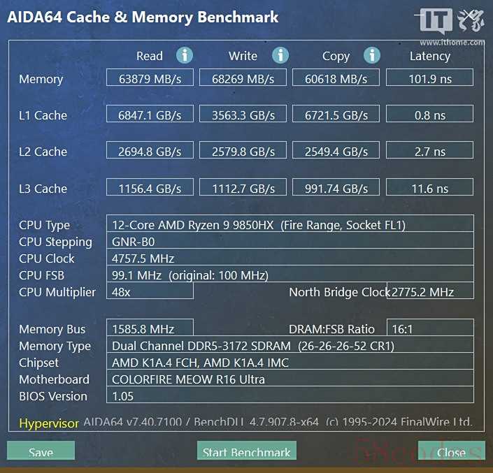 随后IT之家使用 AIDA64 测试了 MEOW R16 Ultra 的内存性能,其读取成绩为 6.4W,写入成绩为在 6.8W 左右,内存延迟达到了 101.9ns,符合双通道 DDR5 5400MHz 内存水准。