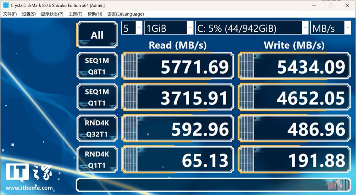硬盘性能上,长江存储的这块 1TB 固态,实际的读写表现尚可。其顺序读取速度为 5771.69MB/s,顺序写入速度为 5434.09MB/s。