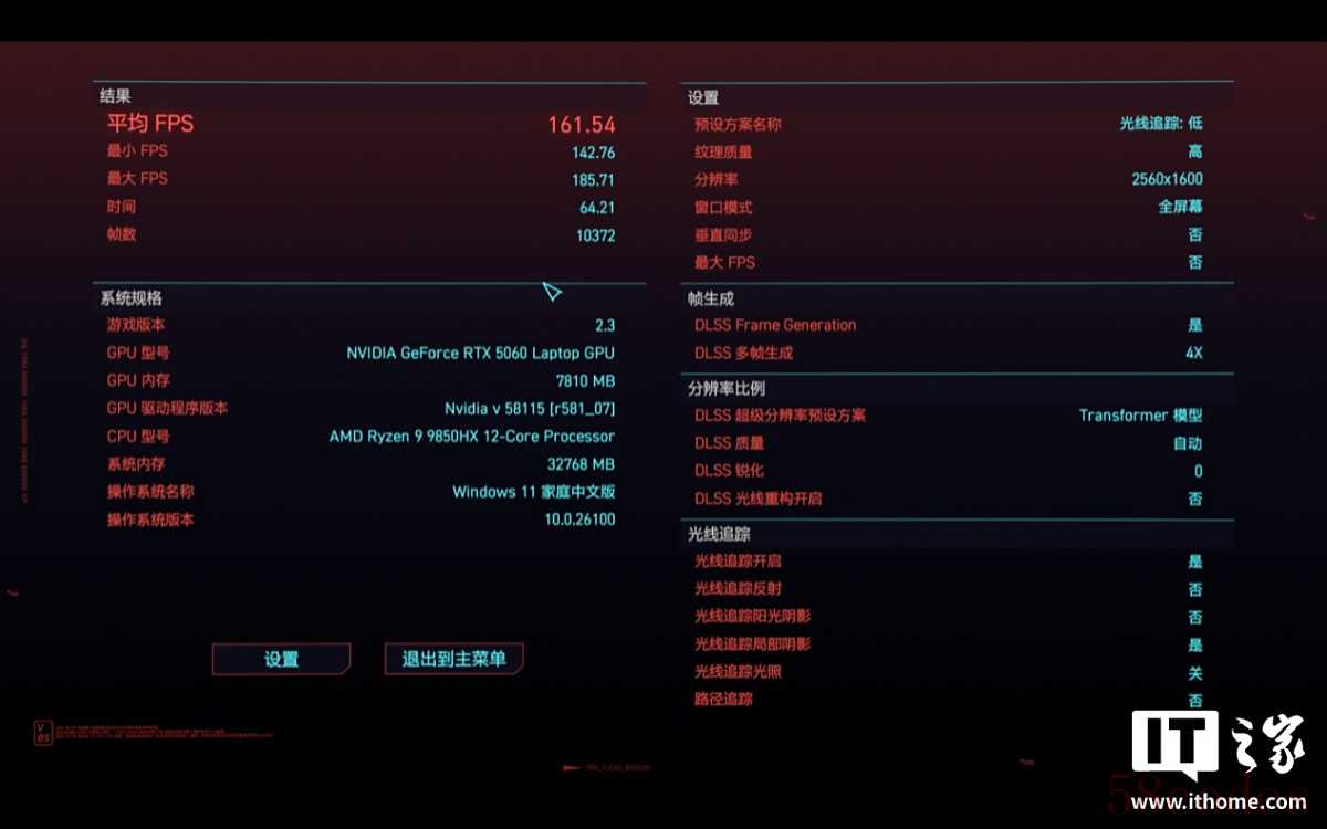 接着我们开启 DLSS4 开启光追低画质,并打开 DLSS 自动选项,DLSS4 帧生成 X4,此时平均帧数为 161.54 帧。有了 DLSS 4 的加持,即使开启光追 MEOW R16 Ultra 都能流畅运行在 2K 分辨率下。