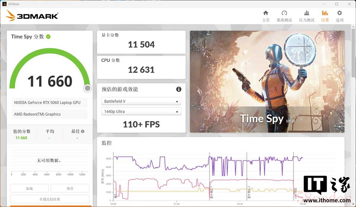 在代表 DX12 游戏性能的 3D Mark Time Spy 的基准测试中,COLORFIRE MEOW R16 Ultra 的显卡分数达到了 11504 分。
