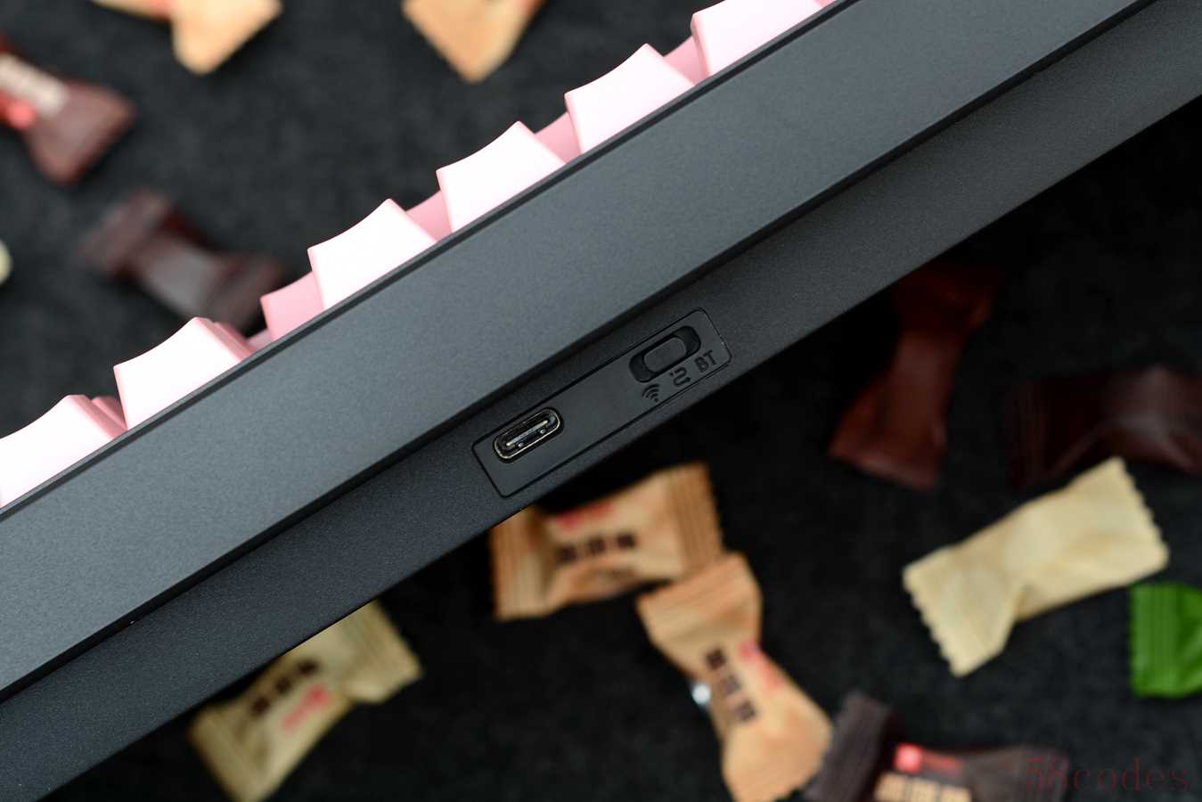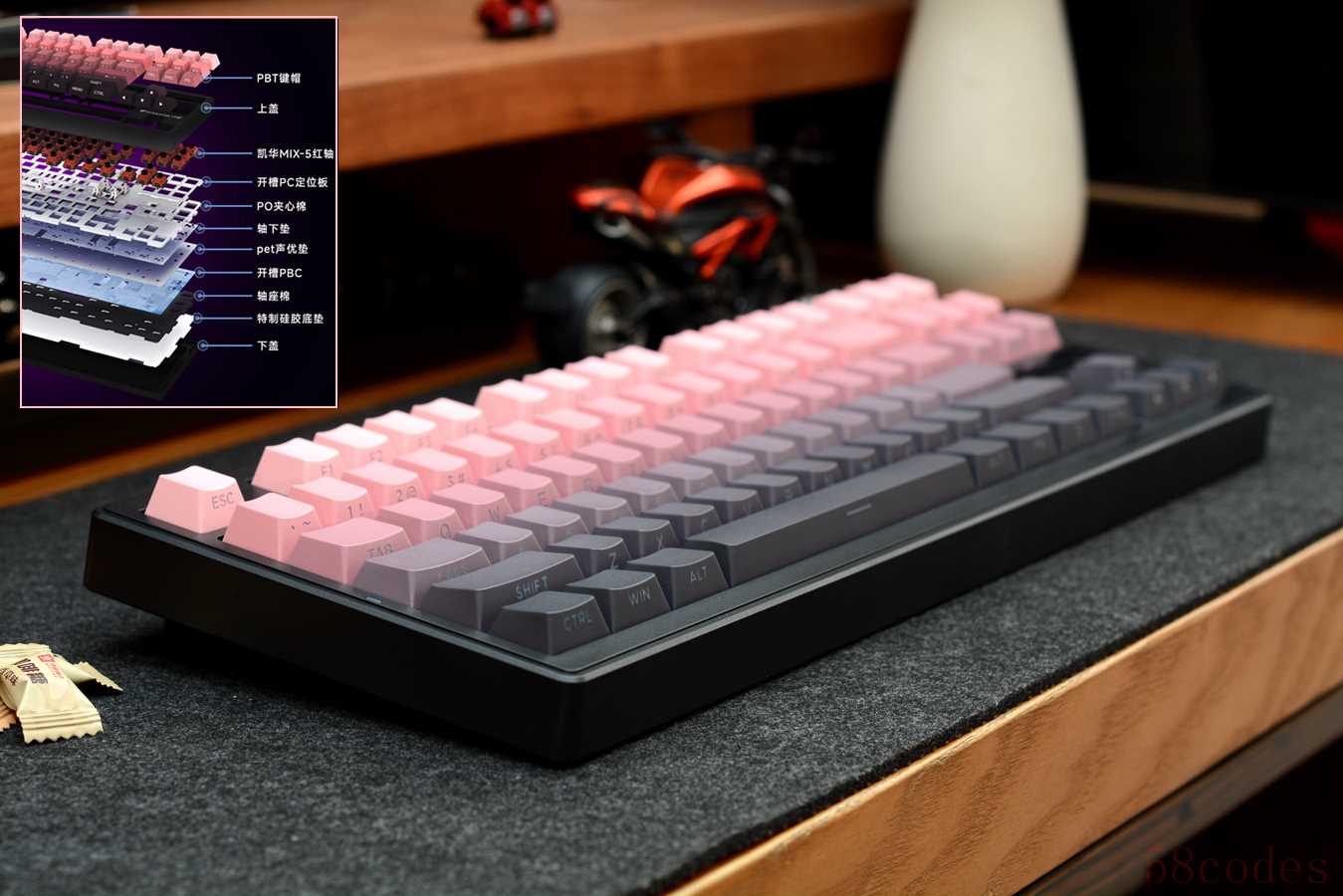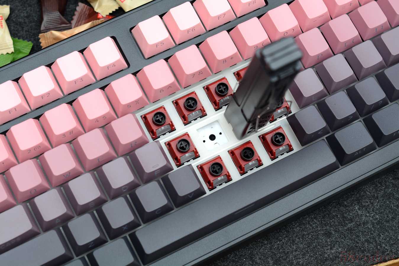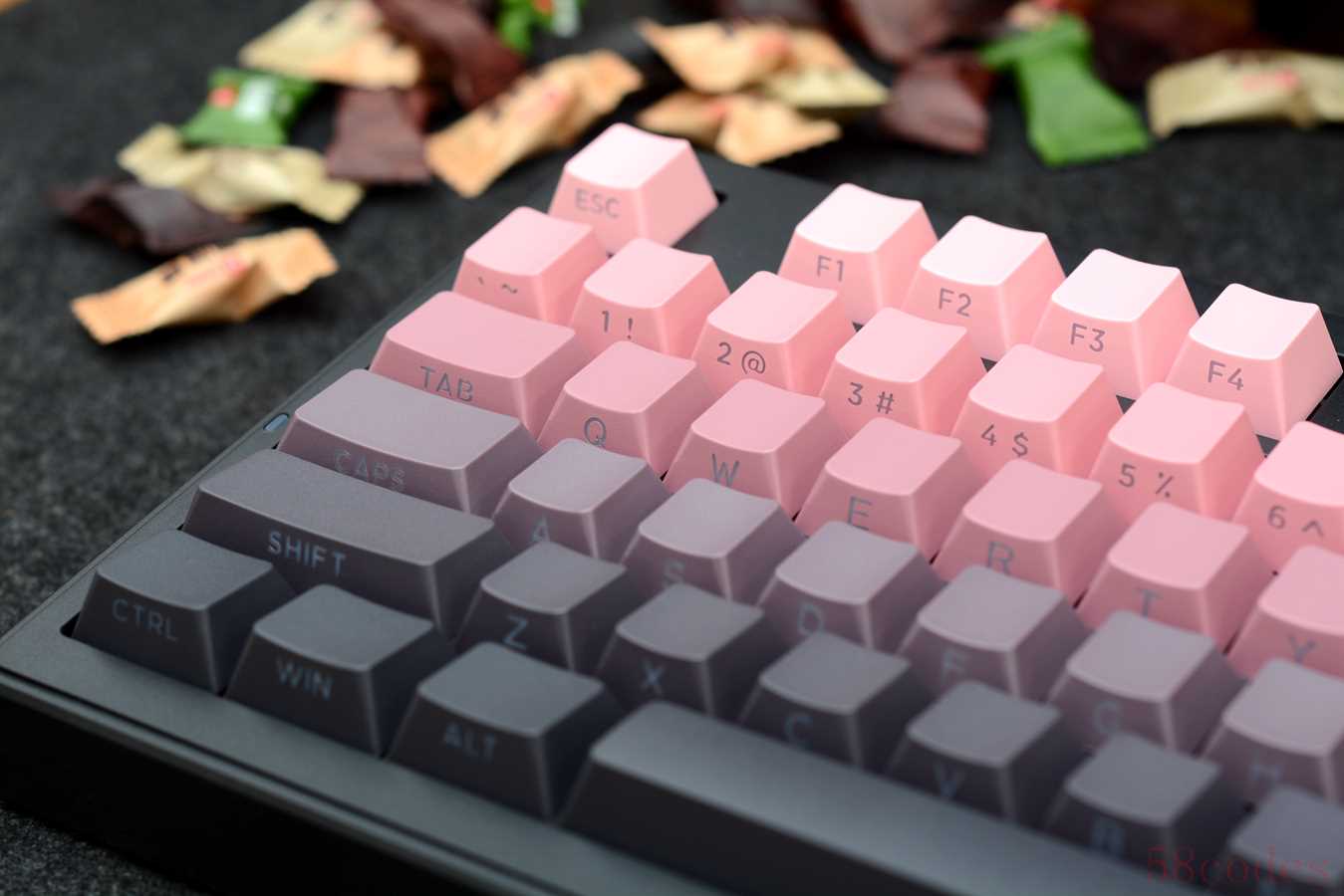 键帽采用PBT材质,双色注塑,原厂高度,侧透设计,粉黑渐变,颜色过度还是比较自然的,下面深色三行键帽需要开启灯光,字体才更清晰一些。